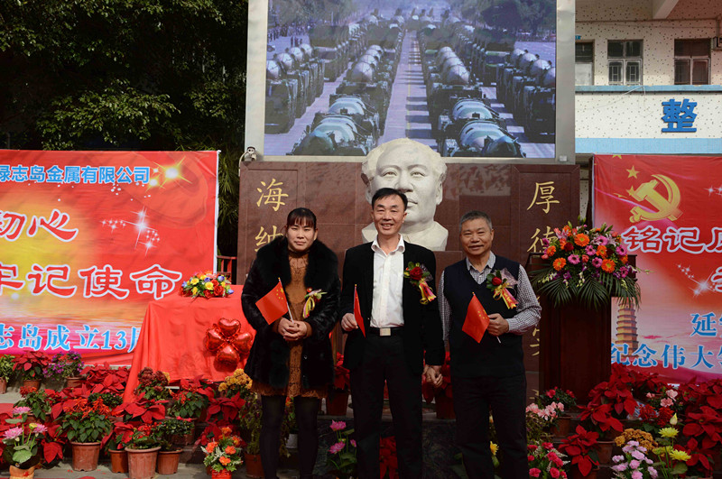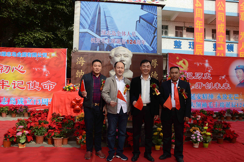 綠志島實(shí)業(yè)由來自湖南的朱祖生先生創(chuàng)業(yè)于2000年,由最初的錫渣冶煉廠經(jīng)過十來年的艱苦奮斗,現(xiàn)在公司產(chǎn)品包括焊錫條、焊錫絲、焊錫膏,助焊劑,清洗劑,防銹劑,潤滑油等。綠志島實(shí)業(yè)的發(fā)展,在以毛主席思想為信仰的指引下突飛猛進(jìn),在“吃水不忘挖井人”的感恩心下穩(wěn)步發(fā)展。為了鞏固毛主席思想作為綠志島的信仰核心,綠志島于2012年12月26日從泰山迎接來毛主席泰山石像,并立于公司內(nèi)部。自此,綠志島每年12月26日都會(huì)齊聚眾多認(rèn)同毛主席的朋友,在綠志島內(nèi)緬懷紀(jì)念毛主席。2017年是綠志島舉辦毛主席誕辰第六年,為此和志同道合的朋友們齊聚一堂,共慶毛主席誕辰。